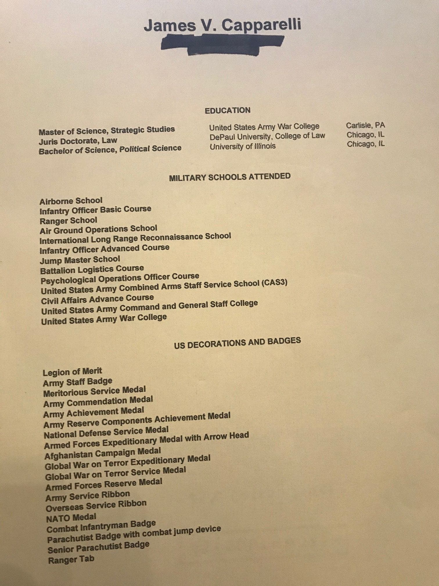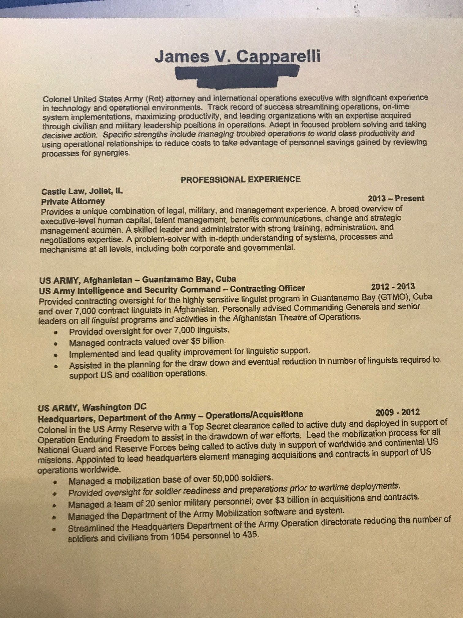 Capparelli's four-page resume states that while he was a colonel in the U.S. Army Reserve he had "a Top Secret clearance" while in Washington, D.C. at the headquarters for the Department of the Army.