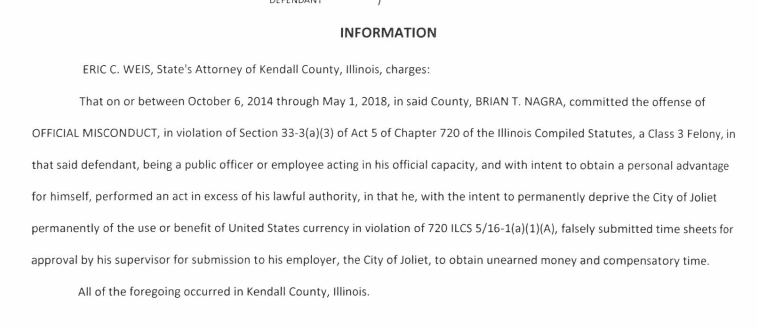 JOLIET, IL — Records obtained from the Kendall County Circuit Clerk show that Joliet Police Officer Brian Nagra was formally charged on Friday with three counts of official misconduct and two counts of theft of between $10,000 and $100,000.
