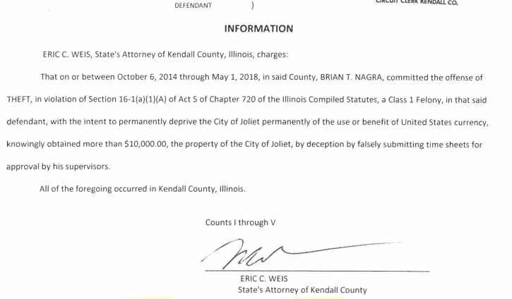 Veteran Kendall County State's Attorney Eric Weis called Joliet Patch back on Friday afternoon said that his first assistant state's attorney had been handling the particulars on the case and his colleague as not in the office Friday. Weis said it was his understanding that Nagra was being charged in Kendall County because his payroll time sheets had been falsified in Kendall County.