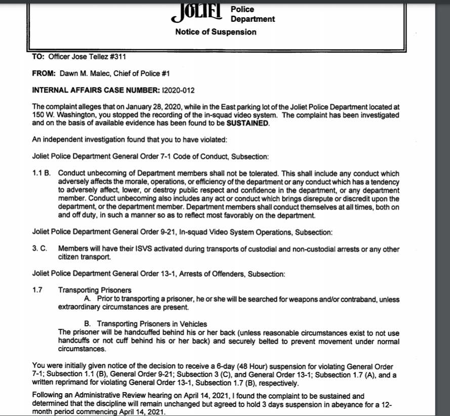 According to the internal affairs memo from April 14, Malec notified Tellez she was giving him a six-day suspension from the Joliet Police Department, and three of those days were being held in abeyance over the next 12 months, documents obtained by Patch through the Freedom of Information Act show.