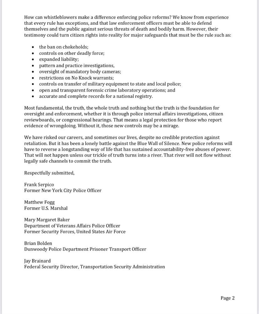 "Now more than ever before, America is blowing the whistle on deeply ingrained abuses. The truth is changing the course of history. Congressional and local leaders are proposing sweeping reforms. It is long overdue that America holds our profession accountable," the first paragraph of the letter signed by Esqueda and Serpico reads.