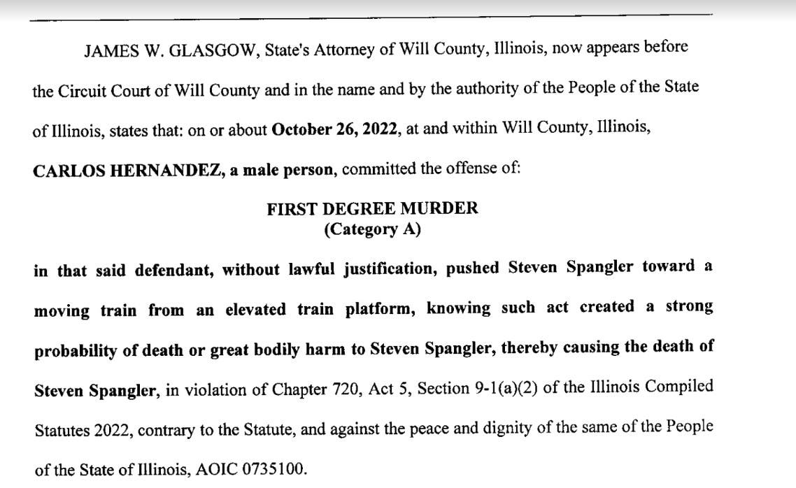 The death of Steven Spangler was investigated by the Metra Police Department. Hernandez was booked into the jail very late Wednesday night and on Thursday, the homeless Joliet man learned that his bail was being set by a Will County judge at $1 million.