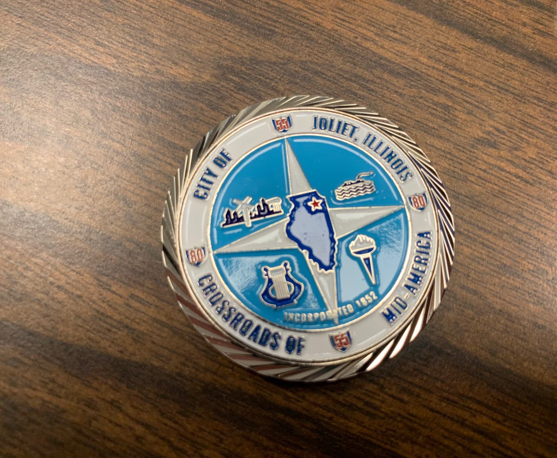 Capparelli said Joliet's three challenge coins were all specially designed. The backside of the city of Joliet coin shows a downtown drawbridge, signifying Joliet's connection with water.