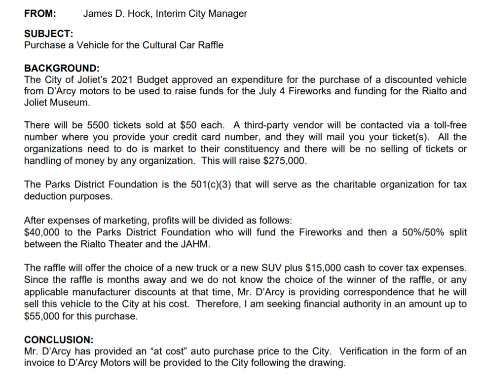 Last week, unsure what became of the D'Arcy Motors automobile July 4th raffle, Joliet Patch interviewed Hock's replacement, Joliet City Manager Jim Capparelli.