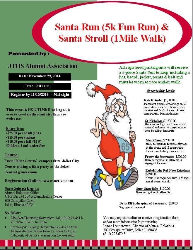 “To accommodate participants of all ages and ability levels, the event can be completed as a ‘Santa 5k Fun Run’ or ‘Santa Stroll 1 Mile Walk,” said Joliet Township High School Alumni Director Lynne Lichtenauer. “The event is not timed and is open to everyone. Families and strollers are also welcome for this exciting event filled with holiday cheer.”