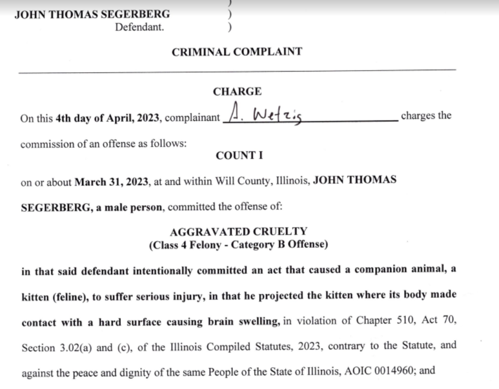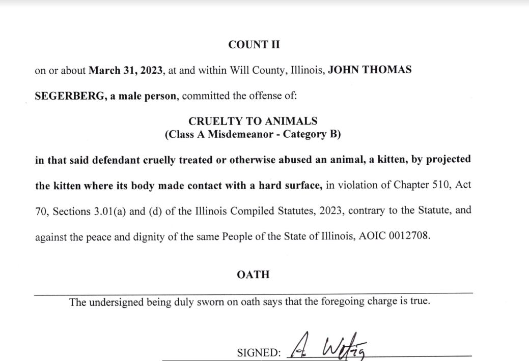 GODLEY, IL — John Segerberg, a 34-year-old resident of Godley, has been charged with aggravated cruelty and cruelty to animals following an incident involving a kitten investigated by the Will County Sheriff's Office investigation.