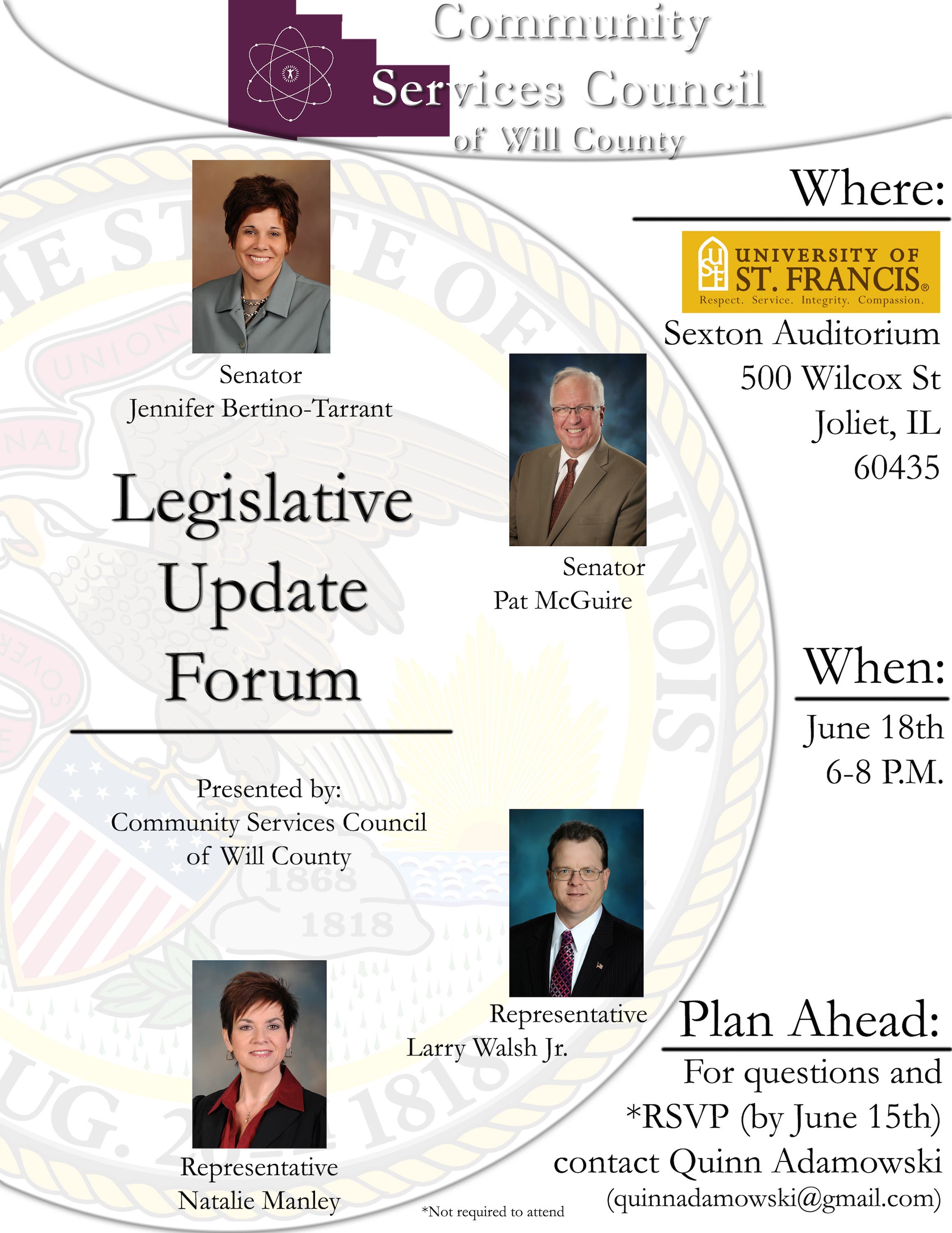 Community Services Council of Will County is hosting a Legislative Update Forum tonight from 6-8pm at University of St. Francis.