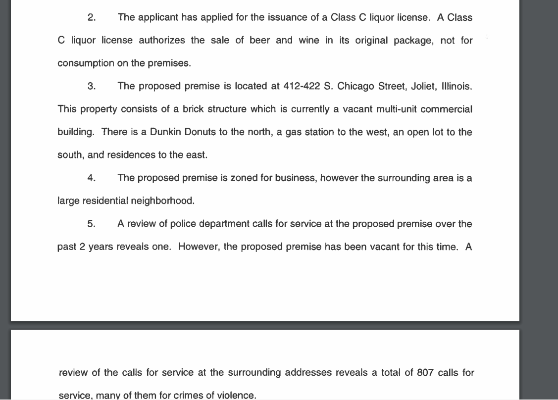 D'Arcy's letter urging the liquor license denial notes there have been 807 Joliet Police Department calls for service in the area "including several violent crimes" during the past two years.