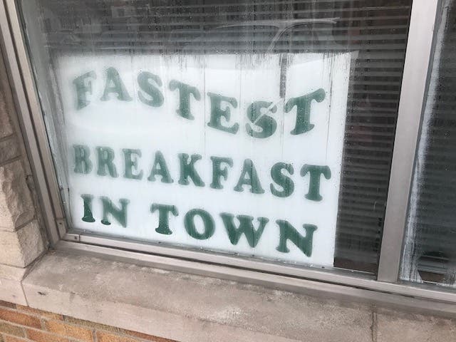 The sign in the front window proclaims: "FASTEST BREAKFAST IN TOWN."
