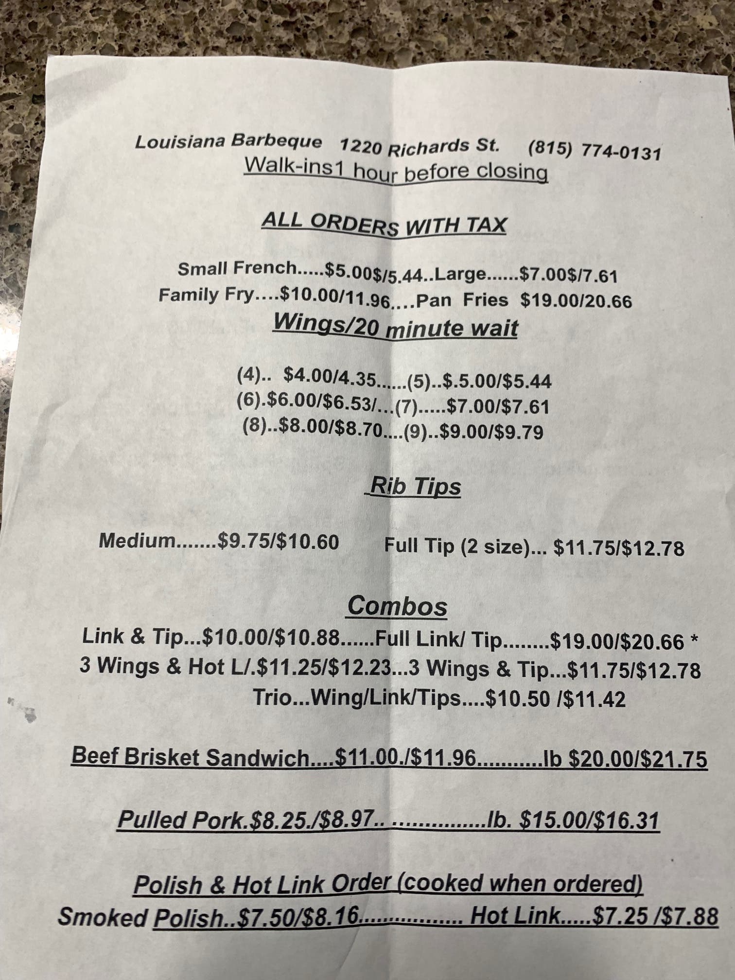 Since 2020, because of the deadly global pandemic, Louisiana Barbeque became exclusively a takeout restaurant. These days, Louisiana Barbeque is open from 2 to 7 p.m. Sunday through Thursday and 2 p.m. to 8 p.m. Friday and Saturday.