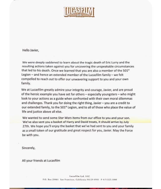 Part of the letter from Lucasfilm reads: "Hello Javier, we were deeply saddened to learn about the tragic death of Eric Lurry and the resulting actions taken against you for uncovering the unspeakable circumstances that led to his death. Once we learned that you are also a member of the 501st Legion — and hence an extended member of the Lucasfilm family —we felt compelled to reach out to offer our unwavering support to you and your own family."