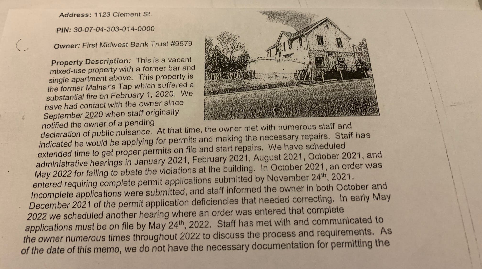 The public nuisance report for 1123 Clement St. stated, "This is a vacant mixed-used building with a former bar and single apartment above. This property is the former Malnar's Tap which suffered a substantial fire on Feb. 1, 2020. We have had contact with the owner since September 2020 when staff originally notified the owner of a pending declaration of public nuisance."