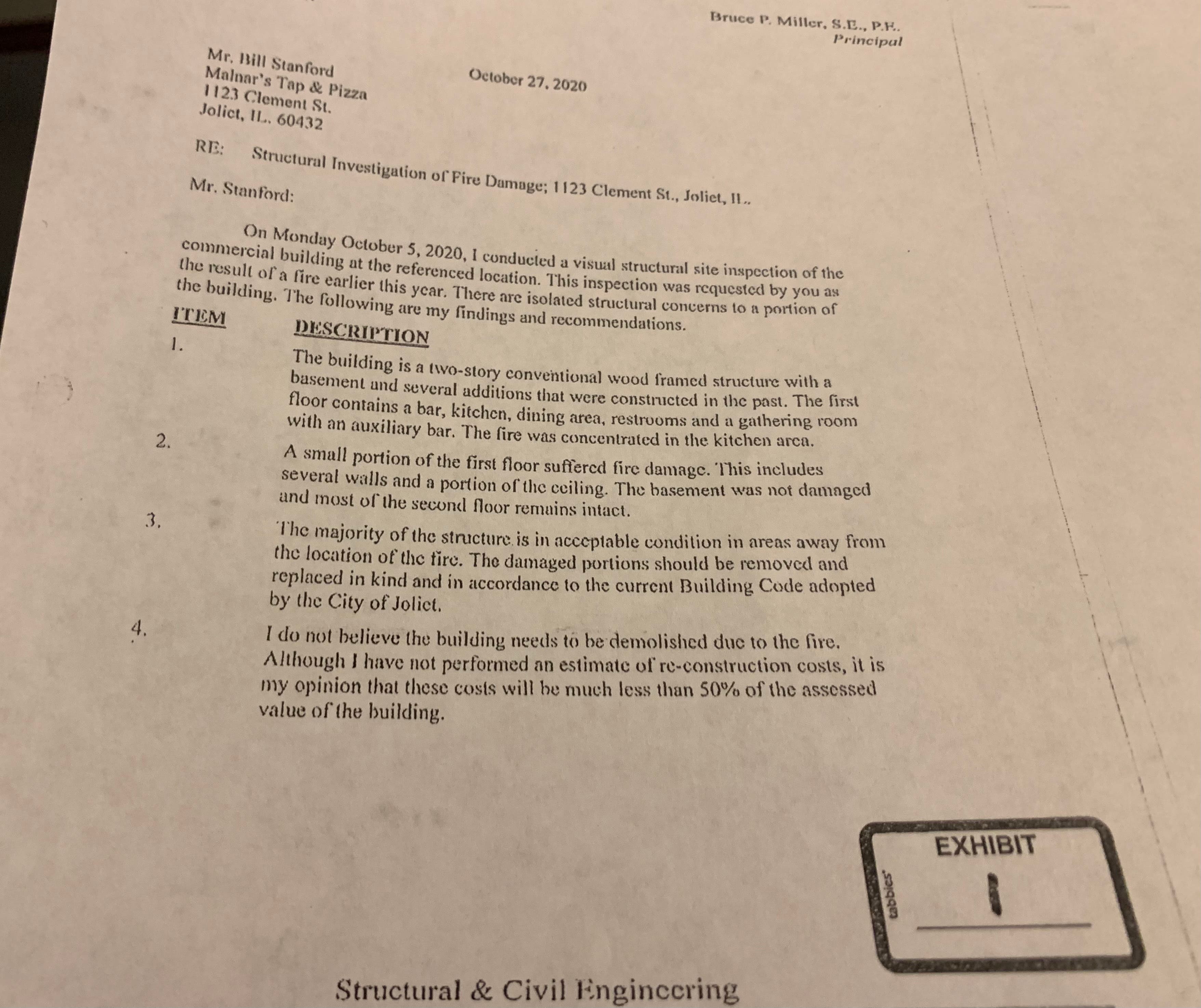 - On Oct. 5, 2020, BP Miller Consultants inspected the site and on Oct. 27, 2020, Stanford got a letter from BP Miller stating, "I do not believe the building needs to be demolished due to the fire."