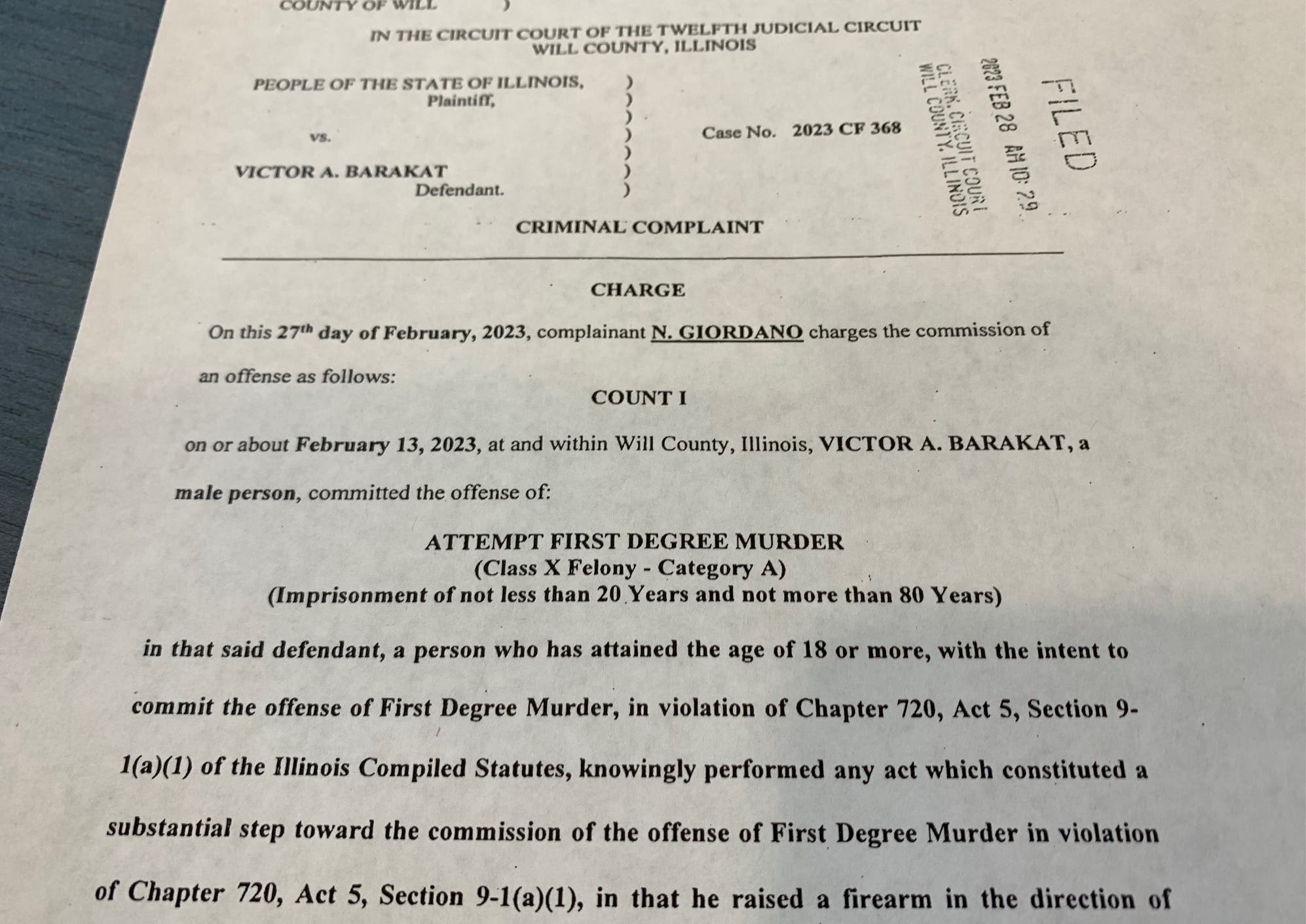 The complaint states that Barakat was convicted 20 years ago, in 2003, of armed robbery in Cook County. At the time of the Feb. 13 shooting in Joliet, Barakat had a 9 mm semi-automatic handgun, according to prosecutors.