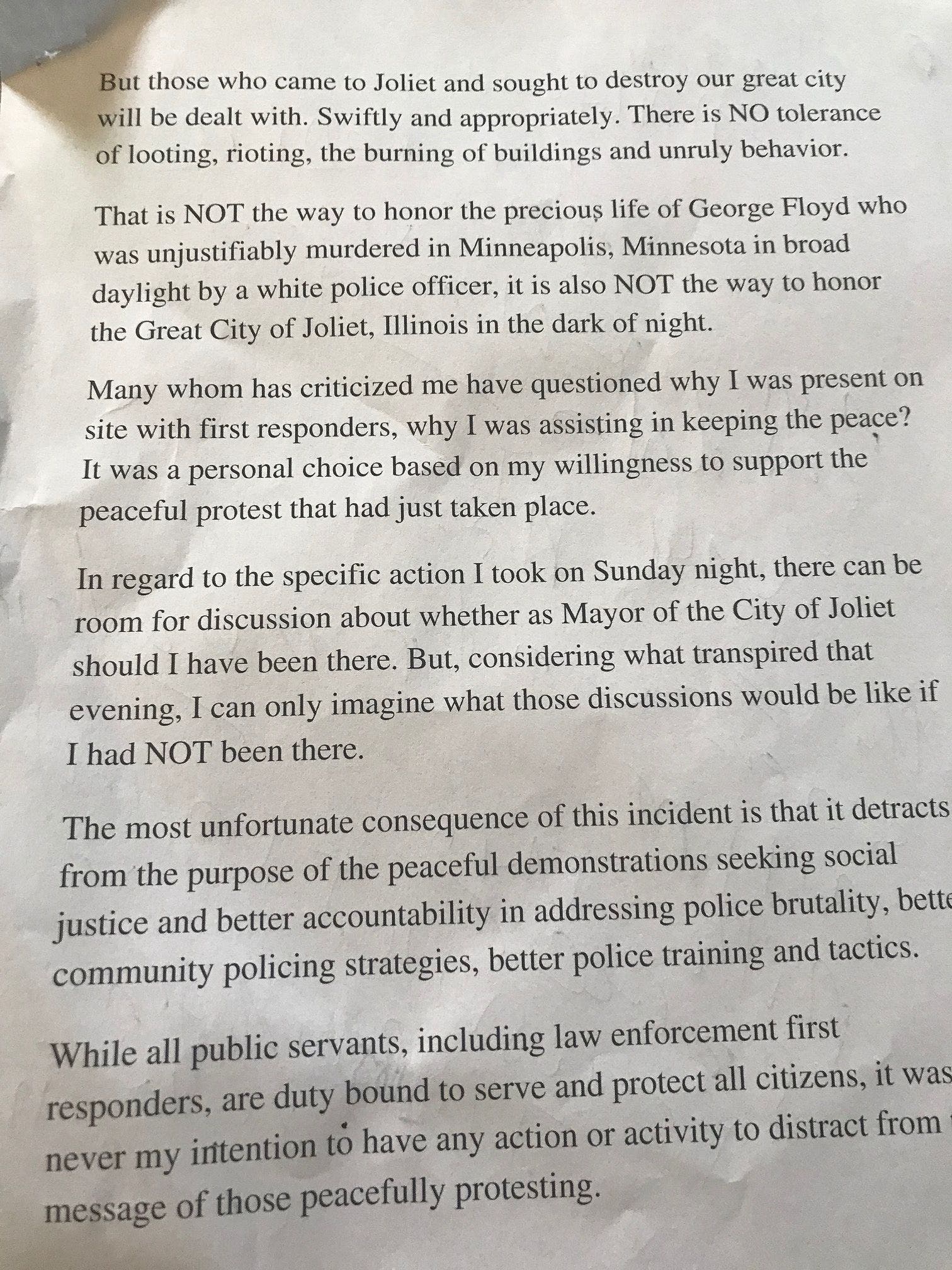 "I hope and I pray that this situation will bring us all together to have those tough discussions," Perez told reporters. "Because, what I saw Sunday night was horrific. I've never, in my 20 years of being a resident of Joliet observed such aggression, such disrespect. I felt hopeless seeing this happen in front of me.