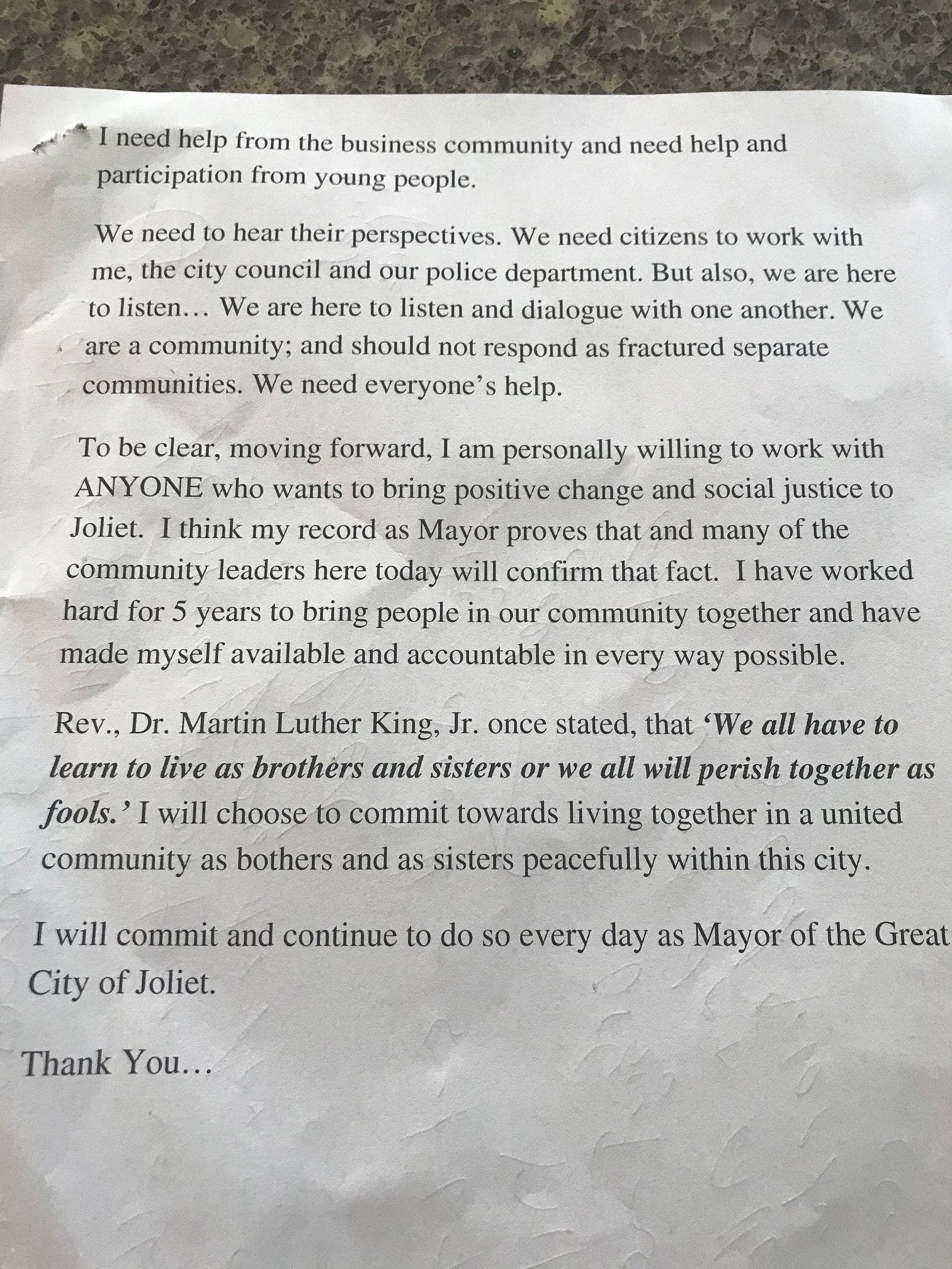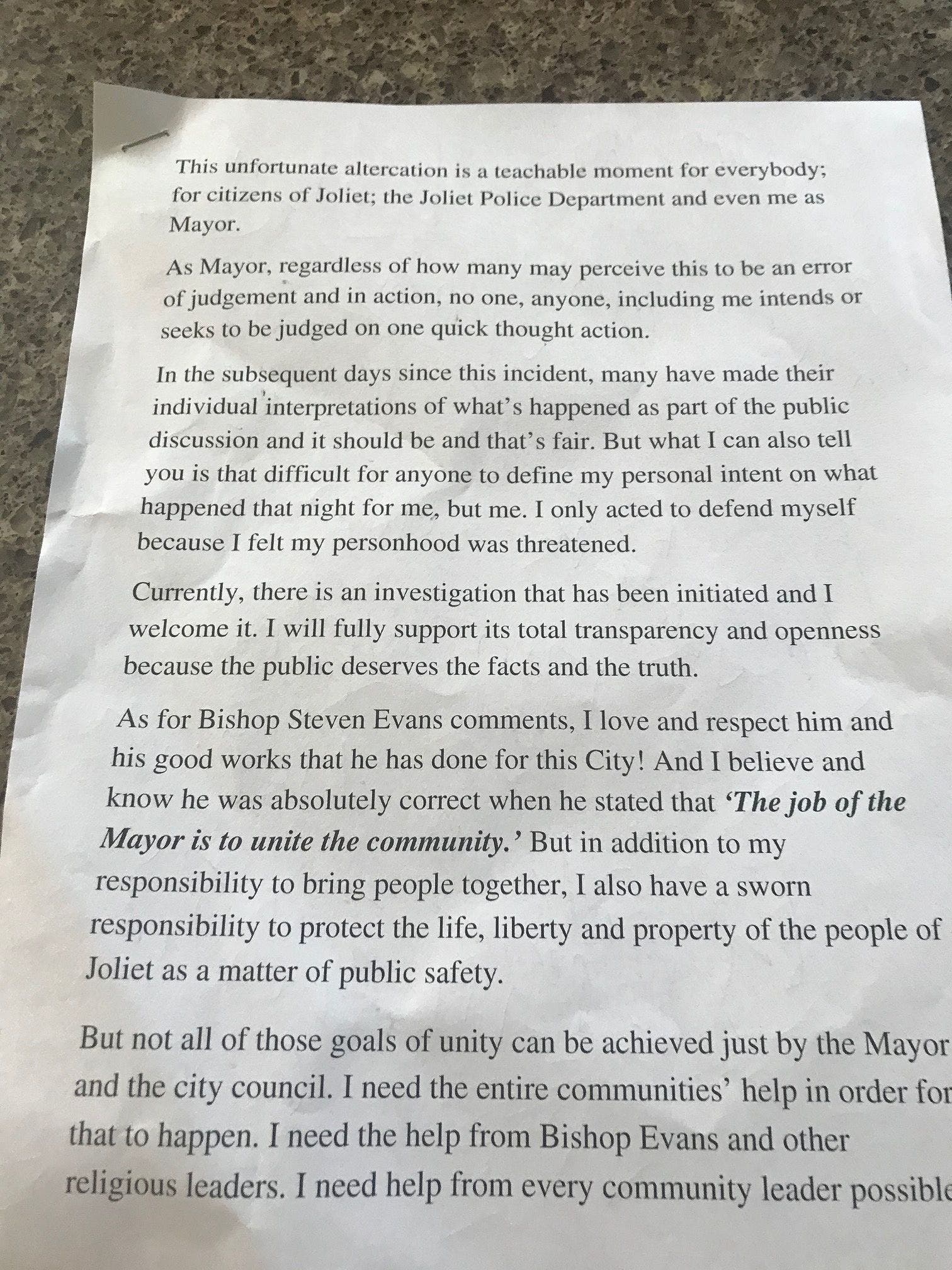JOLIET, IL — Joliet Mayor Bob O'Dekirk wanted his supporters and critics to know that there is no chance he will be resigning from office in the wake of a late night skirmish on West Jefferson Street after street violence erupted in Joliet on May 31.