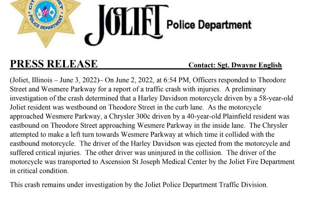 The Joliet Police Department has been notified by the Will County Coroner's Office that the 58 -year-old man motorcyclist involved in the serious crash died Friday morning at Ascension St. Joseph Medical Center, English said.