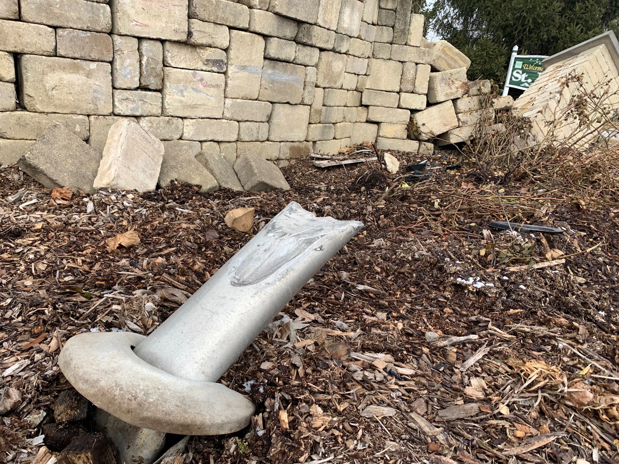 The incident happened more than a week ago, but the ruins were still visible on Friday the 13th. Joliet Patch walked the property Friday morning and found the city of Joliet's flag pole laying in the grass. Several large stones were toppled by the motorist.