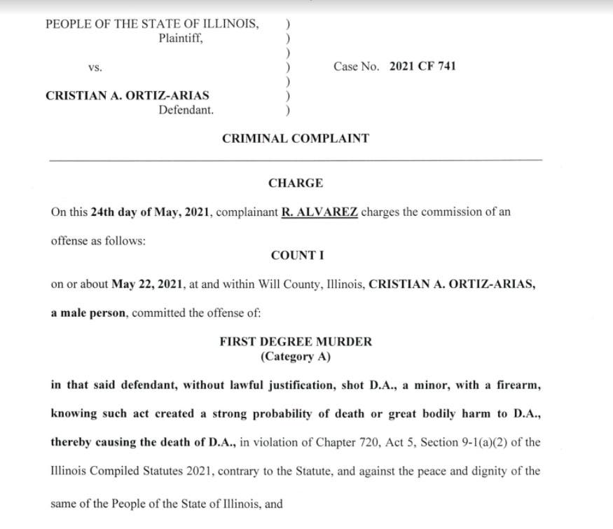 On Monday, prosecutors charged Cristian Ortiz-Arias as an adult in connection with the weekend homicide at 606 East Cass St. Ortiz-Arias is charged with first-degree murder, two counts of aggravated unlawful use of a weapon and one count of unlawful possession of a gun in the homicide of 17-year-old Diego Guadalupe Arriaga, whose funeral arrangements are being handled by the Delgado Funeral Chapel on Landau Avenue.