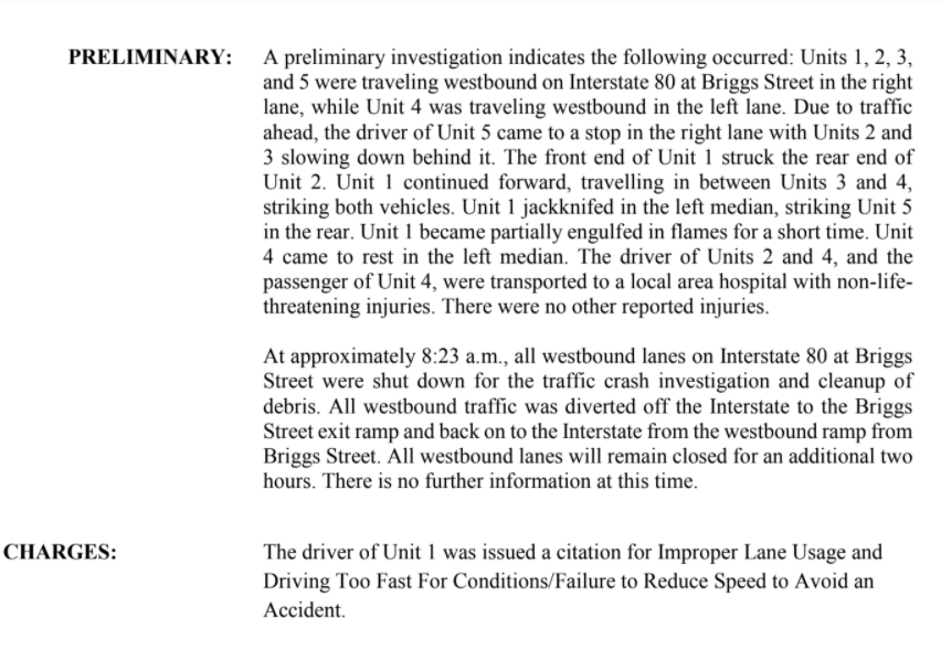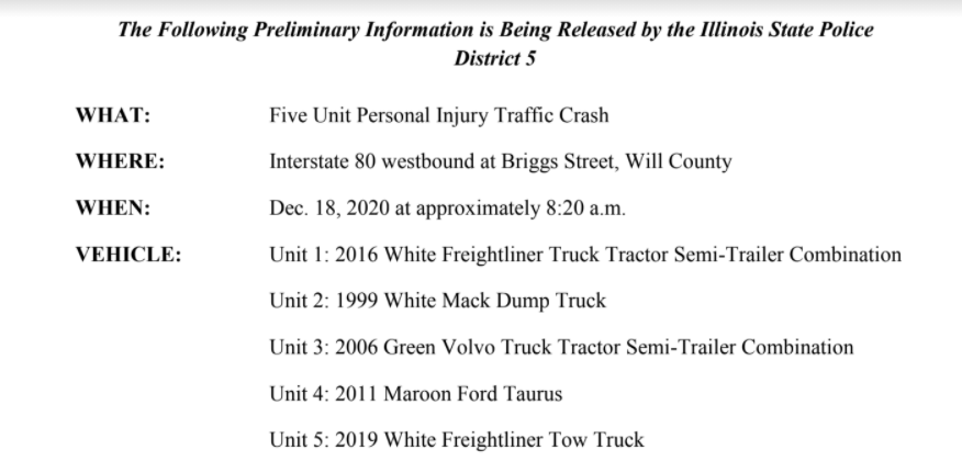 As a result of the crash, Illinois State Police were shutting down all westbound I-80, diverting motorists to the Briggs Street exit.