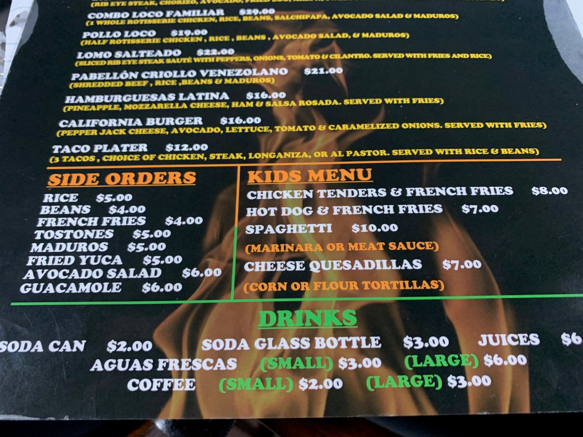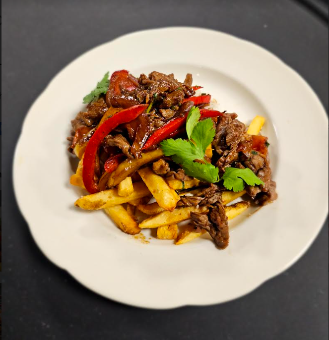 The Bandeja Paisa, a ribeye steak, chorizo, avocado, fried egg, arepa, sweet plantain and crispy pork rinds. The Lomo Saltedo, a sliced rib eye steak sautéed with peppers, onions, tomato and cilantro served with fries and rice. And, Pollo Loco, a half rotisserie chicken with rice, beans, avocado salad and maduros (also known as fried sweet plantains).