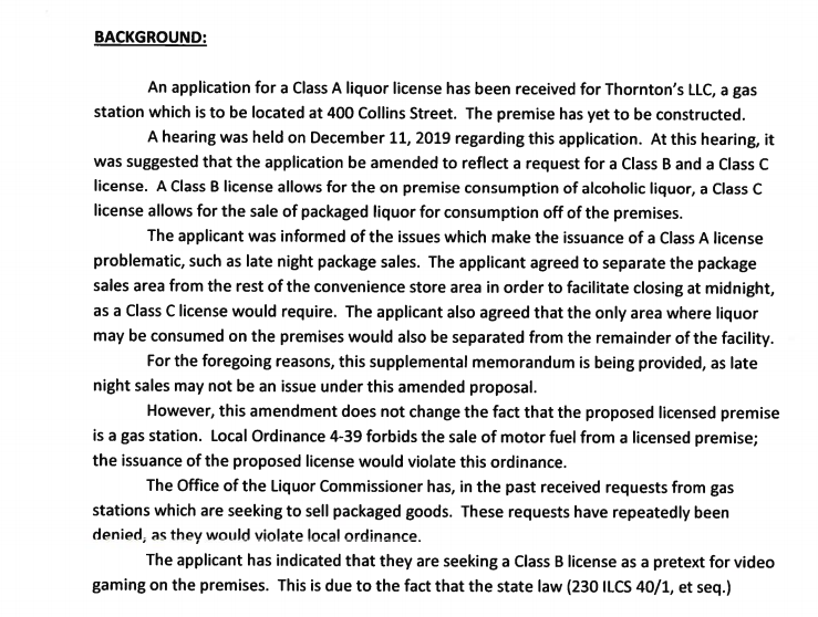 Mayor O'Dekirk, as liquor commissioner, told the council that he did not want the city to approve the Class B and Class C liquor licenses because doing so would set a bad precedent for other gas stations.