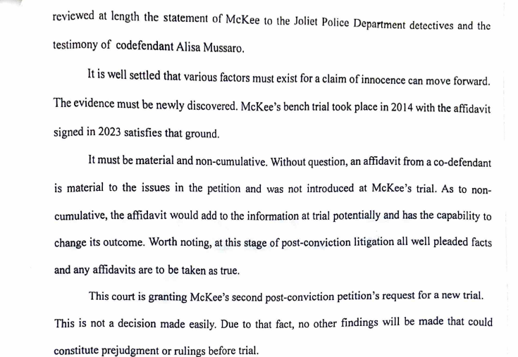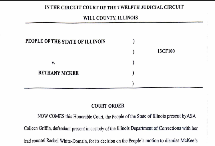 According to Friday's online court docket entry, the Will County State's Attorney's Office was present in Courtroom 501 of Judge Sarah Jones and represented by Colleen Griffin, and McKee was present in custody of the Illinois Department of Corrections. She was then un-cuffed and un-shackled and with her lead attorney, Rachel White-Domain. Judge Jones tendered her decision and granted the defendant's second post-conviction petition request for a new trial.