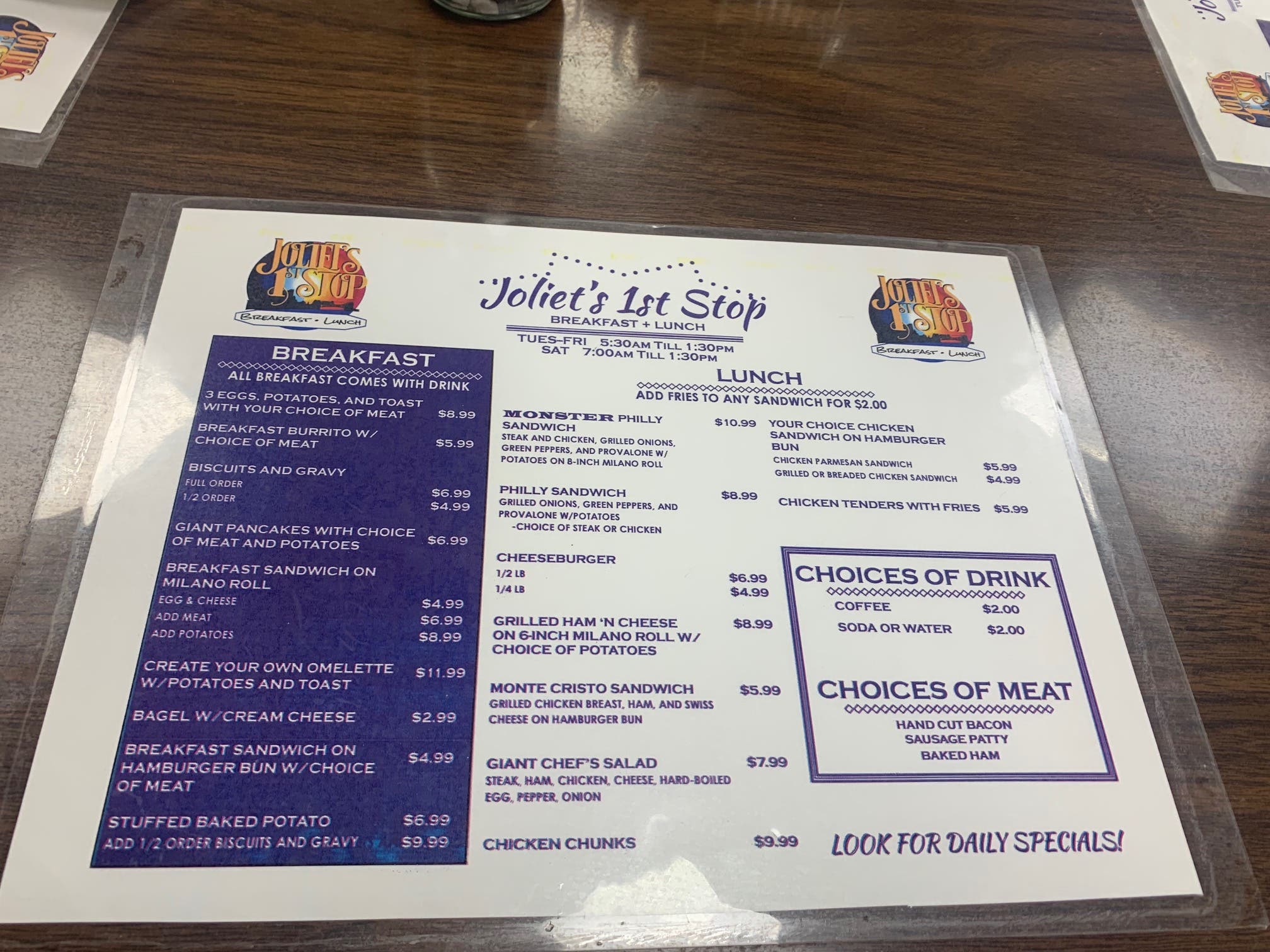 Joliet's First Stop is open 5:30 a.m. to 10 a.m. Monday and 5:30 a.m. to 1:30 p.m. Tuesday through Saturday. It's dine-in or carryout. The phone is 815-791-9837. Joliet's First Stop also uses DoorDash and Grubhub.