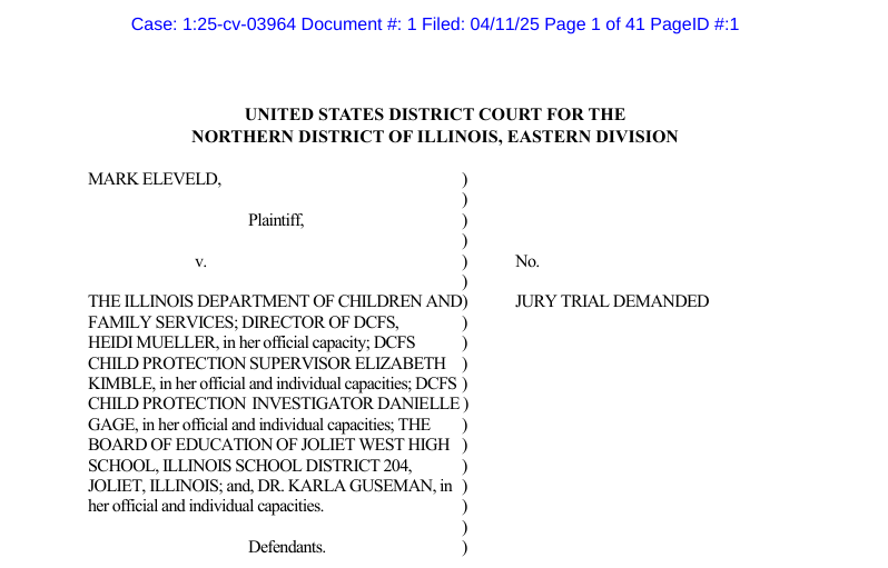"Eleveld was not criminally charged as a result of the incident. However, the Superintendent ordered Principal Teresa Gibson to report to DCFS which investigated the matter and indicated the report against Eleveld as child abuse or neglect allegedly based upon required credible evidence of child abuse when 'the available facts, when viewed in light of surrounding circumstances, would cause a reasonable person to believe that a child was abused or neglected,'" Eleveld's lawsuit noted. "On April 19, 2024, the DCFS Director concurred with the ALJ’s findings of fact and conclusions of law and granted Eleveld’s request for expungement of the indicated findings. The indicated finding and forced resignation in 2022 meant that Eleveld would be unable to secure future employment in his career as a tenured teacher."