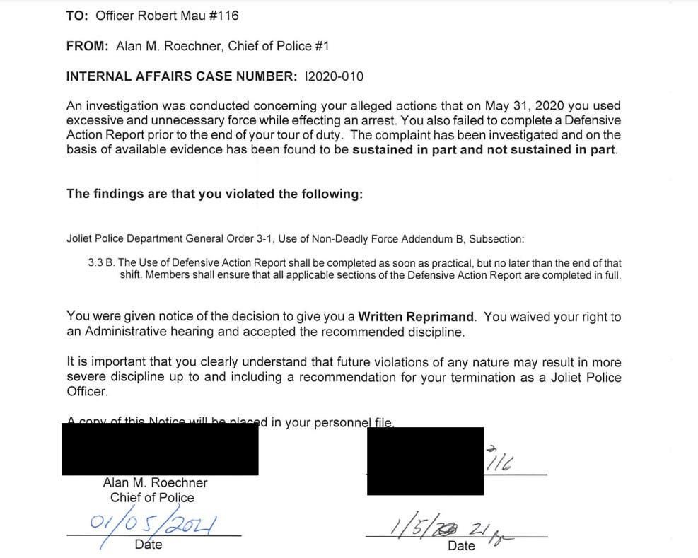 In recent days, Joliet Patch learned Mau received a written reprimand from Joliet Police Chief Al Roechner during Roechner's final days as chief, in January 2021. At that point, more than seven months had passed, and Mau's internal affairs case was still pending.