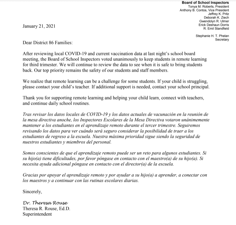 Joliet Public School District 86, which is led by Superintendent Theresa Rouse, agreed to remain with remote learning activities for the rest of the 2020-21 school year.