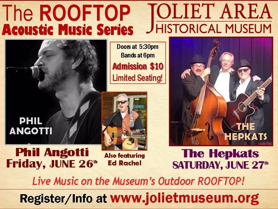 In accordance with the "Restore Illinois" plan, we are pleased to announce the phased reopening of the Joliet Area Historical Museum's "Outdoor Rooftop Acoustic Music Event" with two new shows on Friday, June 26th featuring the talented Phil Angotti (Beatle Brothers, Great Moments In Vinyl) with guest Ed Rachel, and The Hepkats will perform some acoustic and dancin' blues on Saturday, June 27th! Register NOW as tickets very limited to apx. 80 guests.