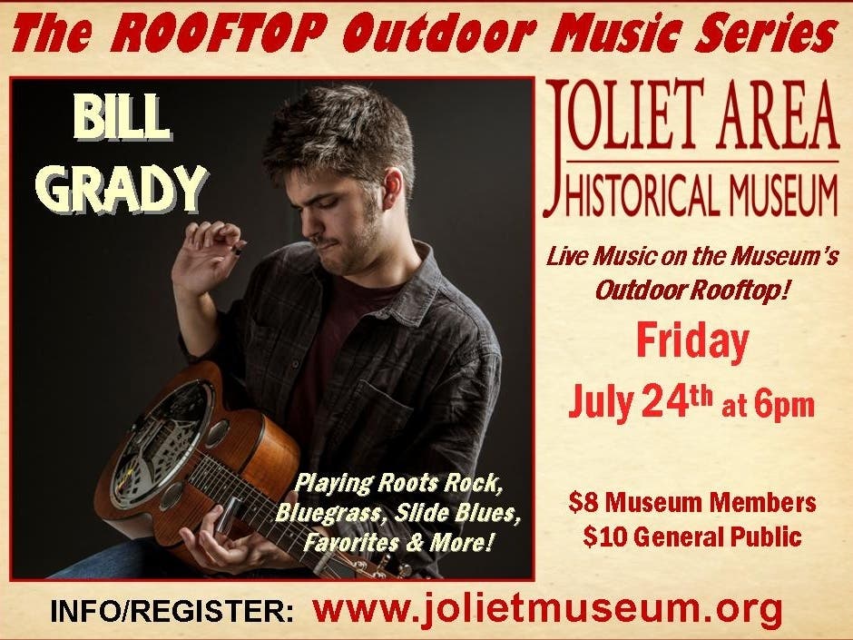 The Joliet Area Historical Museum's "Outdoor Rooftop Music Series" continues on Friday, July 24th featuring the super talented BILL GRADY playing Roots Rock, Slide Blues, Bluegrass, Favorites & More! Get ready to enjoy some fantastic music on the beautiful Outdoor Rooftop!