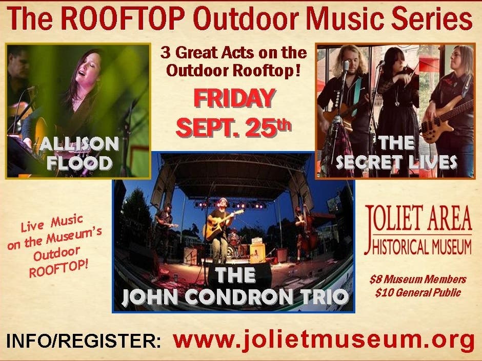 The Museum's "Outdoor Rooftop Music Series" continues Friday, Sept. 25th with a line-up of 3 fantastic area performers! This don't miss concert features Allison Flood, The Secret Lives, and The John Condron Trio!