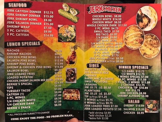 There's a lot on this menu, not only does Bernie's boast a Caribbean flair, but the food is also influenced by Southern, Mexican and Italian cuisines. Side dishes include plaintains, sweet potatoes and lasagna. There's a special taco Tuesdays. Dinner specials also include ribs and catfish.