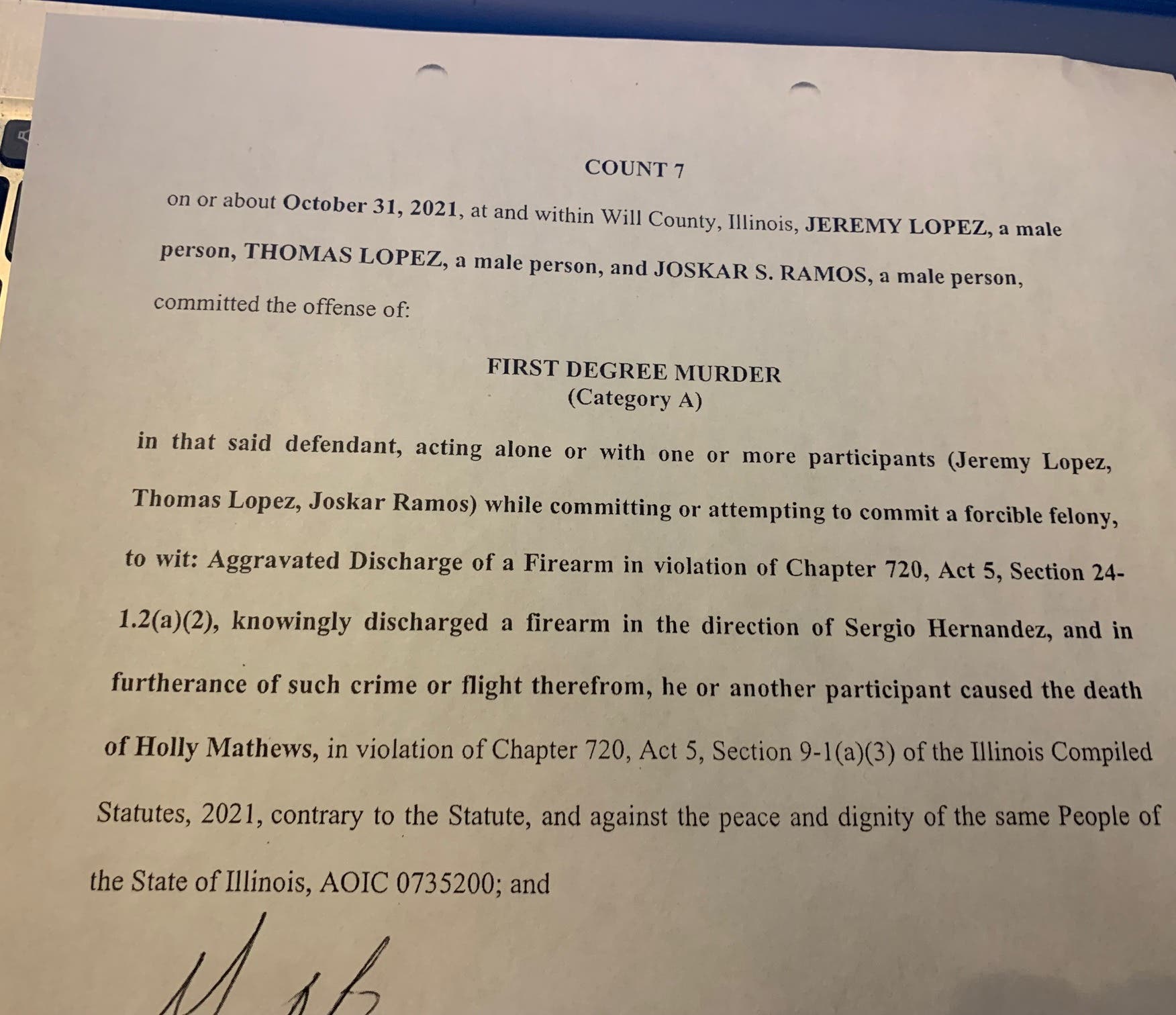 "It appears that this incident was gang related," the Will County Sheriff's officials previously announced. The sheriff's office has also said that the two homicide victims, Jonathan Ceballos and Holly Mathews, were not involved with any gangs.