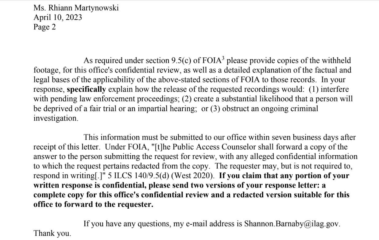 Patch's appeal of the Illinois State Police's FOIA denial, sent to the Attorney General's Office for their review, stated in part that, "The Illinois State Police, the investigating agency, has refused to release the videos of this shooting even though it is common practice for Illinois police agencies to release within a timely fashion the videos of police shootings for the sake of public transparency.