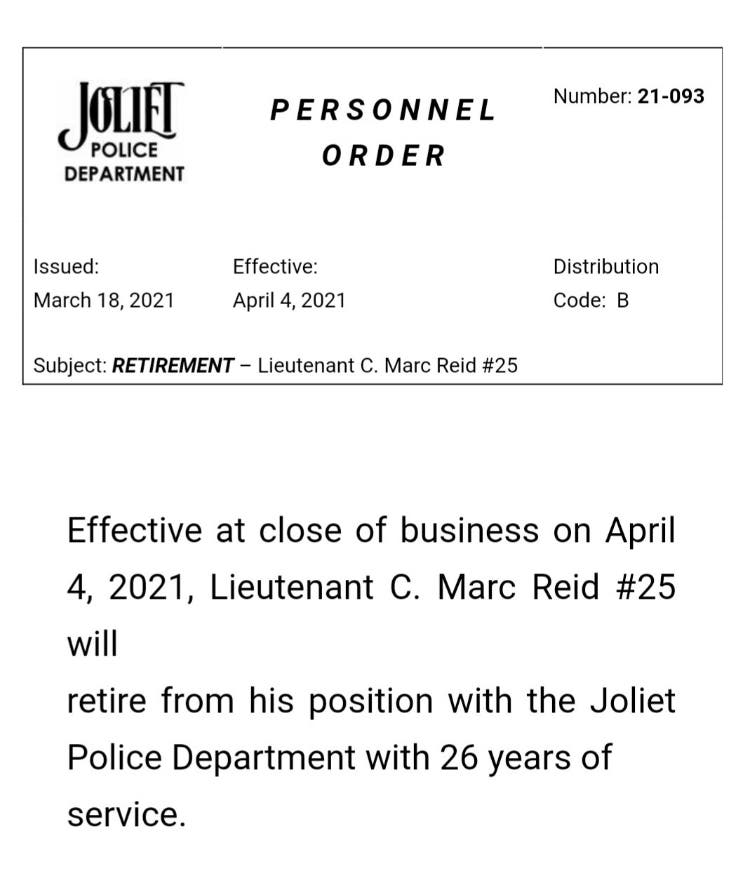 A lieutenant in rank, Reid will officially retire one day after he turns 50 years old, according to a police department document obtained by Patch. On Thursday, Joliet police officials were notified of Reid's upcoming retirement.