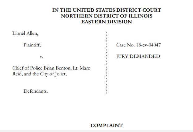 "Allen accepted the discipline to stay employed," his lawyer states. "Thereafter, he was suspended for 15 days. Allen attempted to withdraw his charge at the EEOC, but the EEOC recognized that the city of Joliet was engaging in unlawful retaliation, so they did not dismiss the charge."