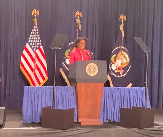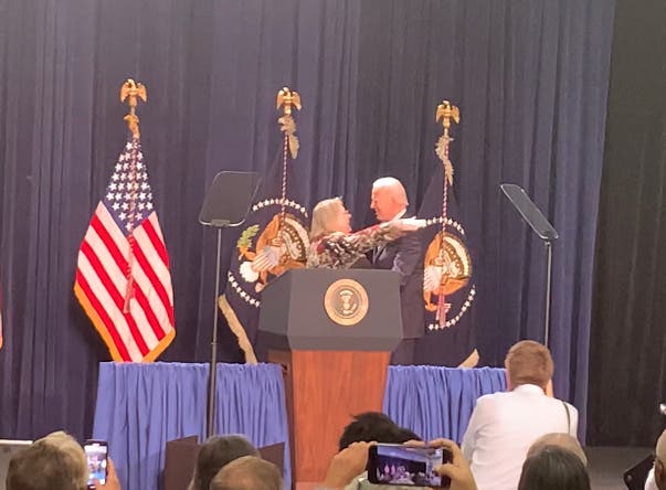 As his speech continued, Biden proclaimed, "We're making real progress thanks to people like Lauren and the rest of your delegation. I said, she's a nurse at heart. She'll protect Social Security and Medicare, take on big pharma(ceuticals) and lower drug prices, make American health care a right, just not a privilege.