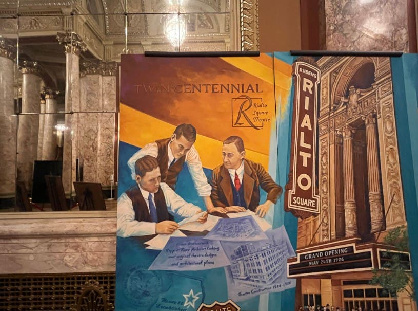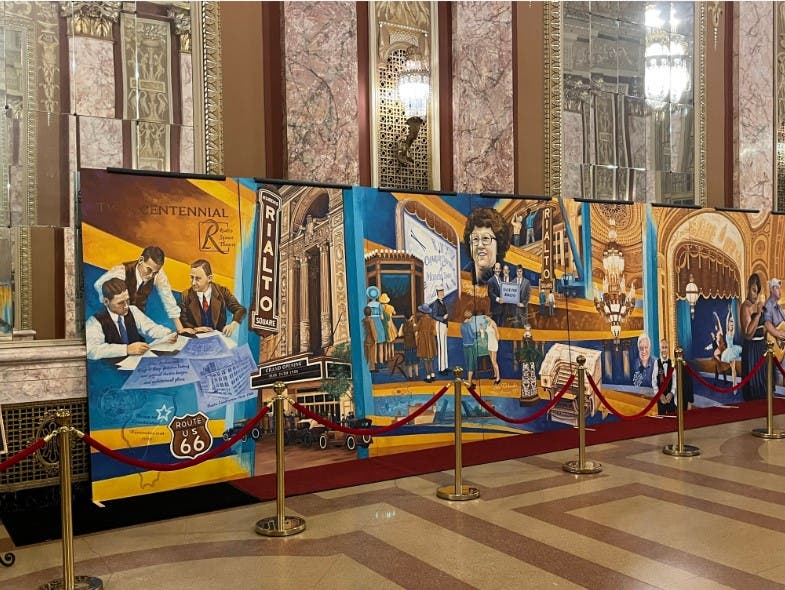 JOLIET, IL — The Rialto Square Theatre unveiled its “Twin Centennial” mural on Monday, February 27. This mural, painted by local artist Dante DiBartolo, was created to celebrate the centennial of both Rialto Square Theatre and Route 66 in Illinois.