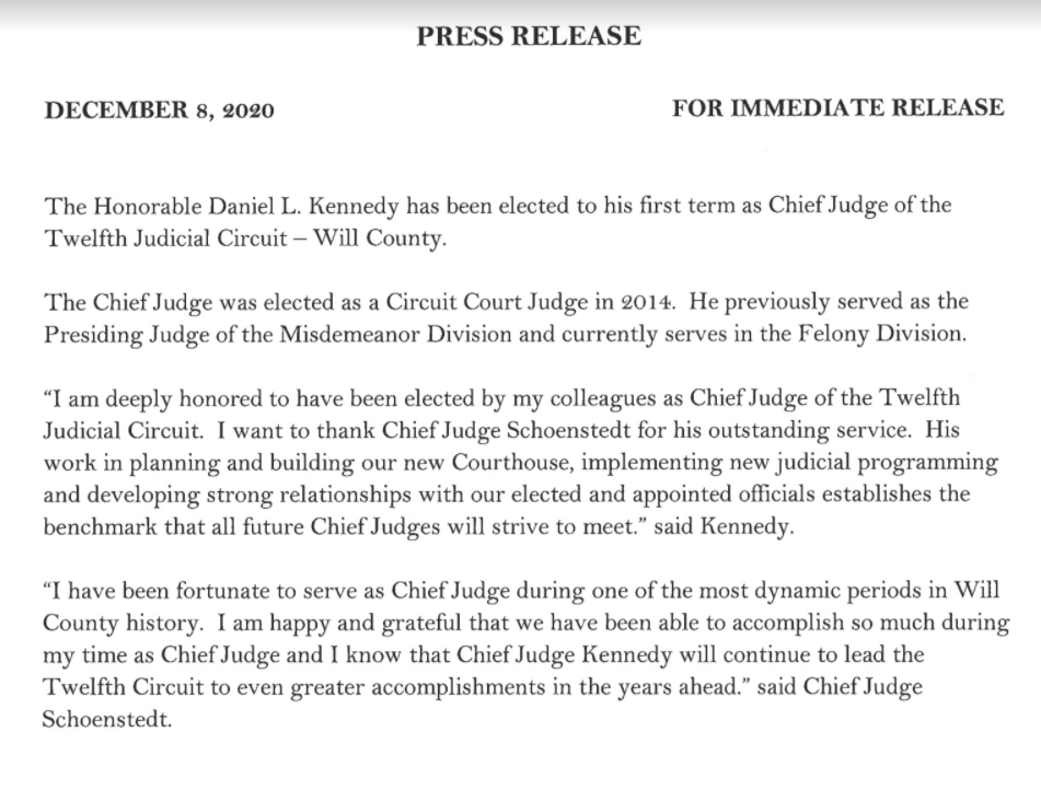 Tuesday's news release indicates that Daniel Kennedy will be the new top judge of Will County's Twelfth judicial court.