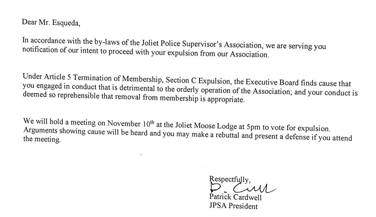 "Was there a 35-to-1 vote to expel Javier Esqueda from the Joliet Police Supervisor's Association after this letter was handed to him?"