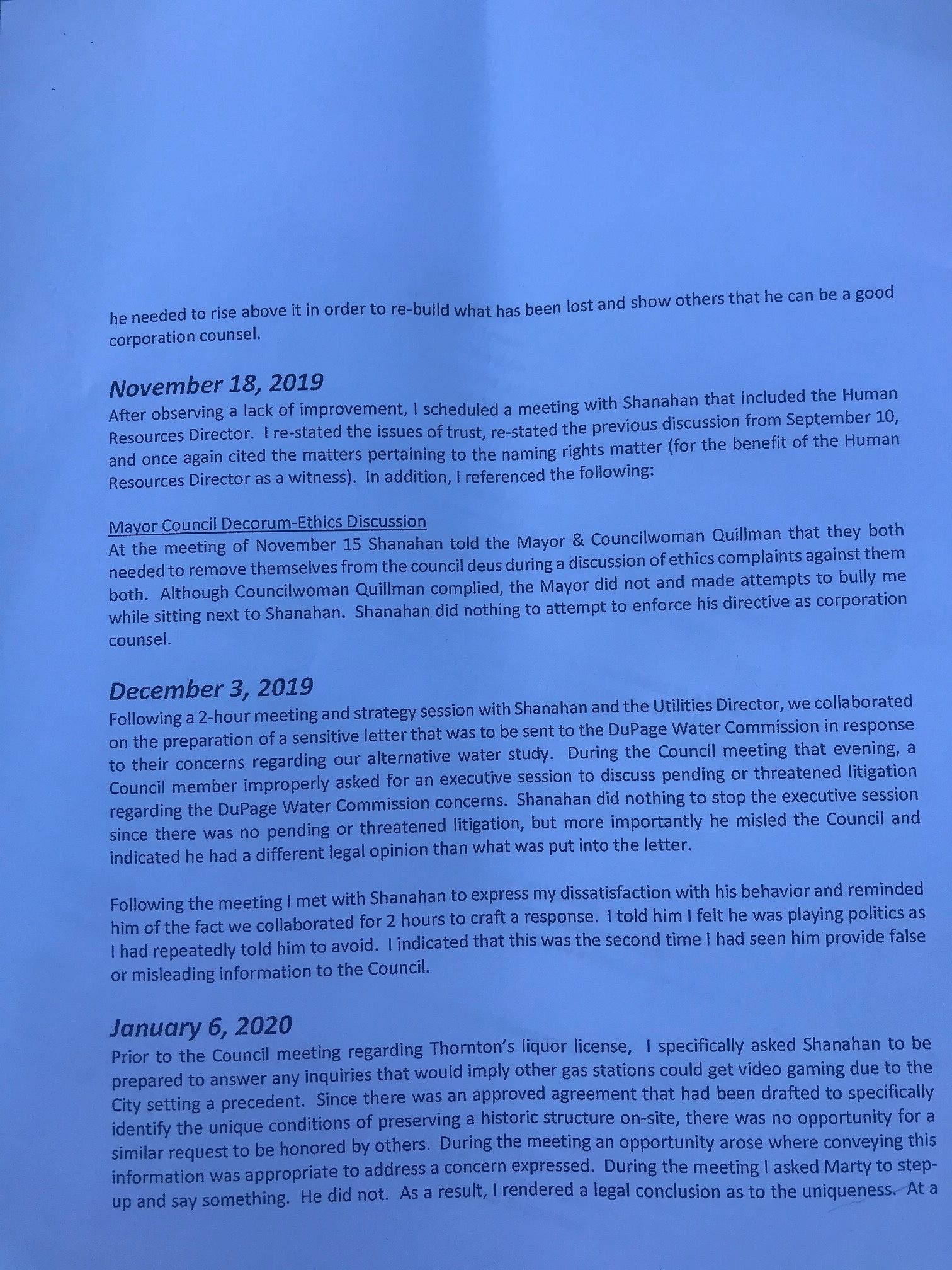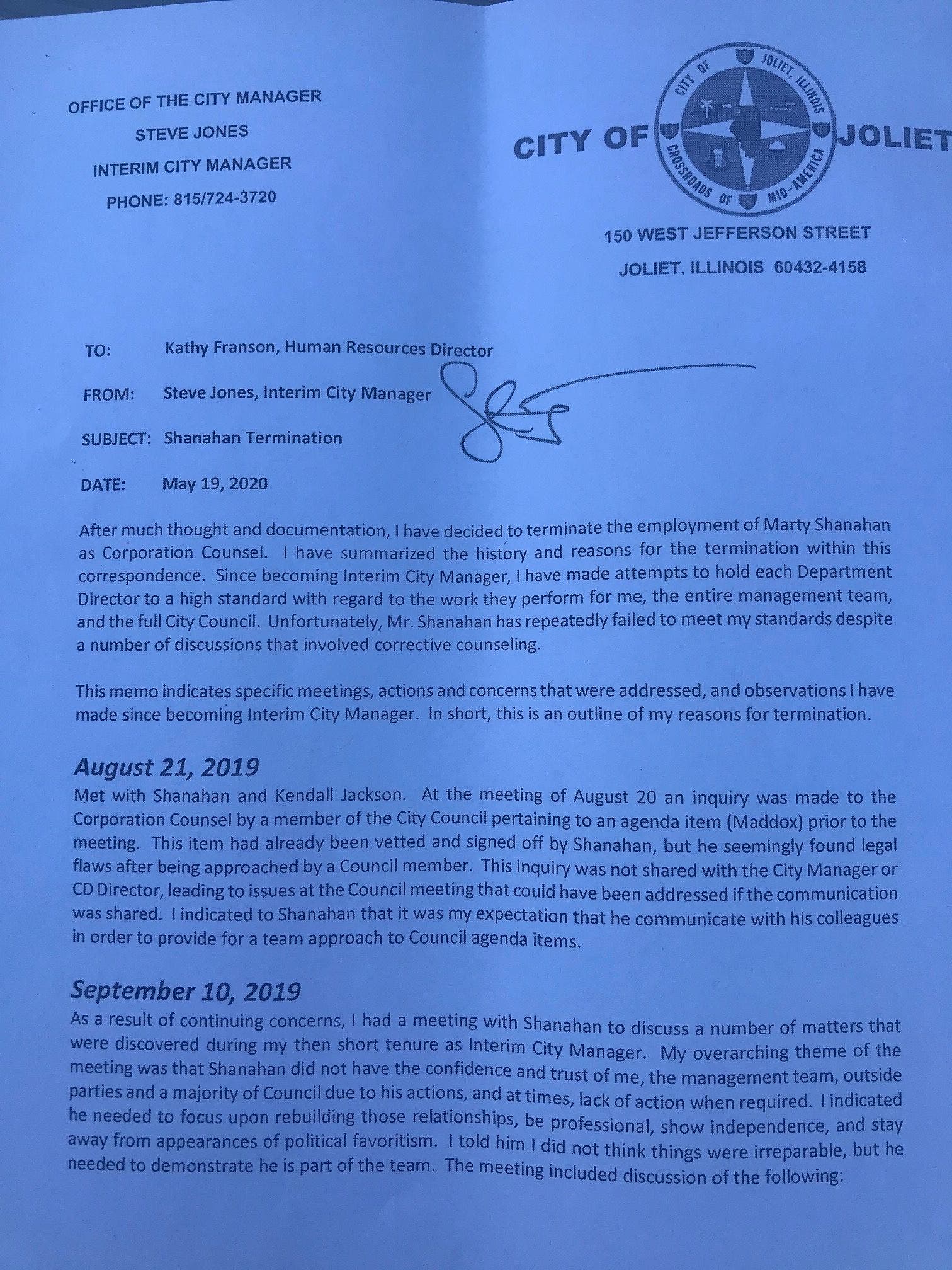 May 19, 2020 — Shanahan speaks during a Council meeting advising city officials that several Joliet police disciplinary case appeals remain on a backlog because "it was incumbent on Roechner to file the appropriate charges before the (Police and Fire) Board in order to initiate the hearing process on the pending disciplinary appeals. Shanahan further advised ... he had made this requirement known to both Jones and Roechner." Afterward, Jones told Shanahan to leave the executive session and wait in his office. Later, Jones informed Shanahan that he was being discharged as corporation counsel effective May 22, 2020.