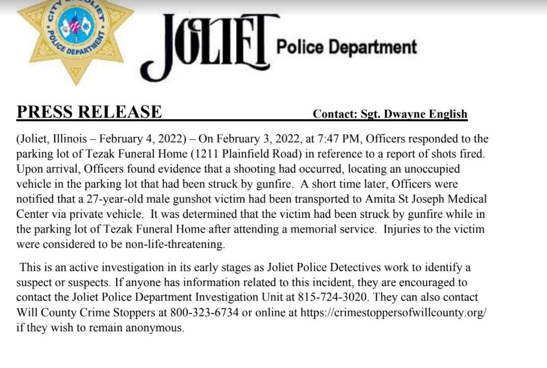 JOLIET, IL — A 27-year-old man suffered non-life threatening gunshot wounds during a shooting in the parking lot of the Tezak Funeral Home on Plainfield Road on Thursday night. The victim was attending a funeral service when the shooting happened around 7:45 p.m.