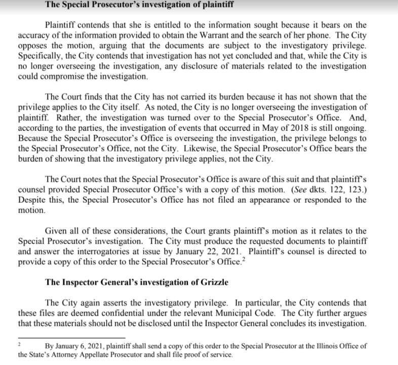 "The City’s opposition does not explain at any level of specificity why discovery production would interfere with either its own Inspector General’s investigation or the Special Prosecutor’s investigation," the federal magistrate concluded. "The City must produce the requested documents to plaintiff and answer the interrogatories at issue by January 22, 2021 ... the Court grants plaintiff’s motion.