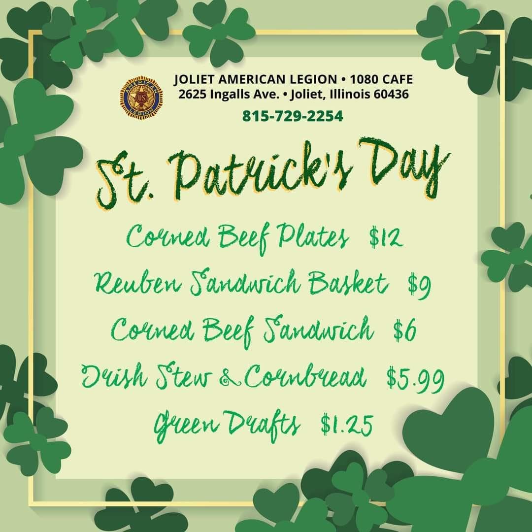 Chefy's Kitchen and Catering, 1511 Plainfield Road, Joliet: Corned Beef and Cabbage with Potatoes and Carrots and Milano Marble Rye Bread $12.40. Corned Beef Sandwich with Chips $9.30. Fritz’s has $3 Powers & Kilbeggan Shots. $4 Guinness Pints and $5 Irish Green Teas and Irish Mules.