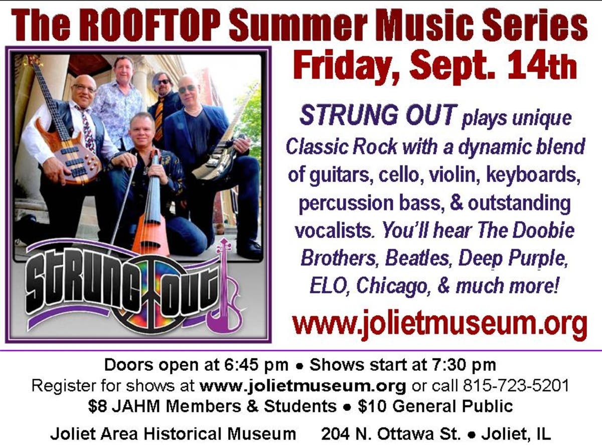 STRUNG OUT is Chicago's most unique classic rock band, using a dynamic blend of guitars, cello, violin, keys, bass & percussion, topped off with outstanding vocalists to create an unforgettable sound. You'll hear the greatest stuff from The Doobie Brothers, Led Zeppelin, ELO, Deep Purple, and much more! So get ready to sing, dance, and have fun with the amazing musical experience only STRUNG OUT can provide.