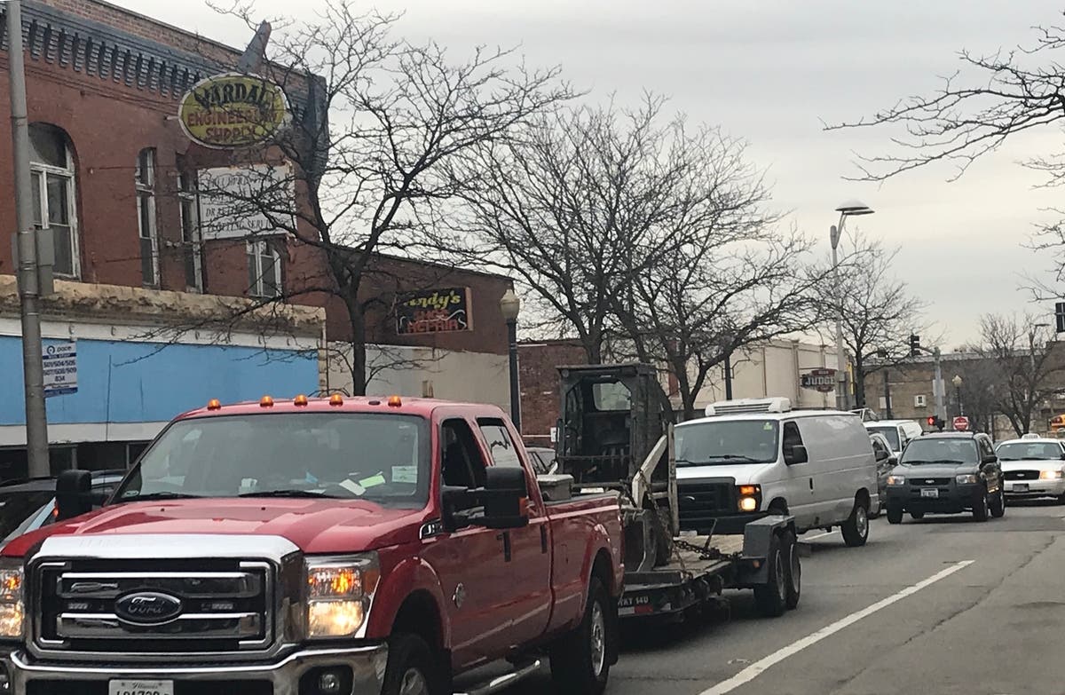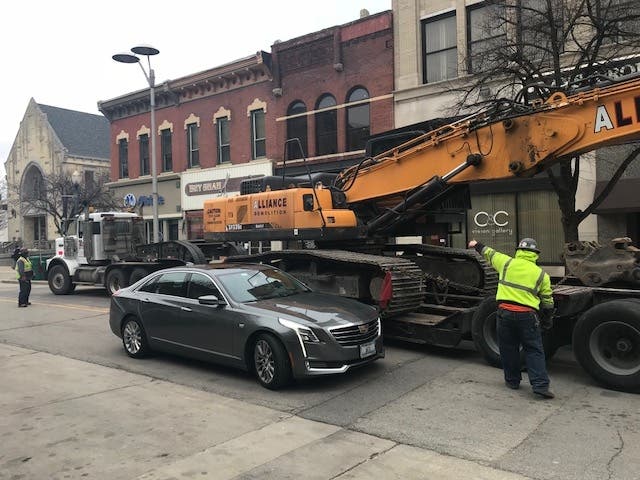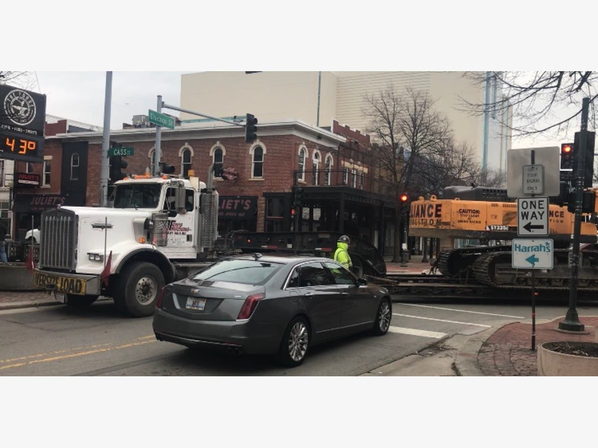 The truck carrying the Alliance Demolition crane was stuck in traffic on Cass Street, causing a huge traffic snag for motorists trying to get across the Des Plaines River from Joliet's east side.