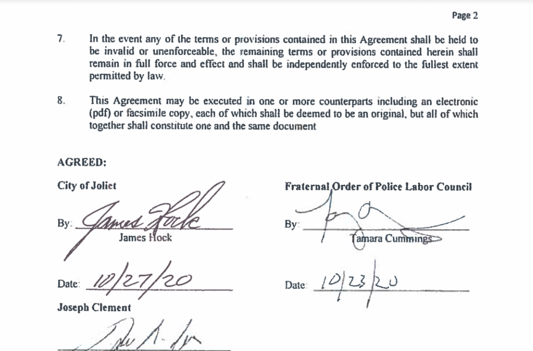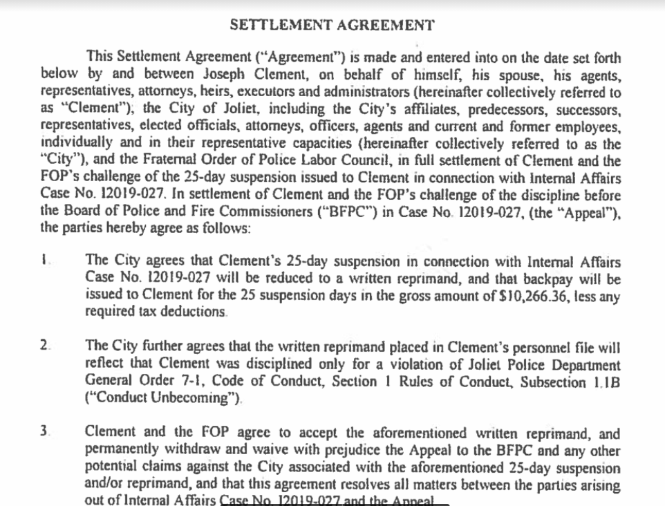 Joliet Patch reached out to Clement Tuesday after learning that interim city manager Jim Hock approved a settlement regarding Clement's appeal of his 200-work hour suspension from being aired in front of the city's police and fire board later this week.